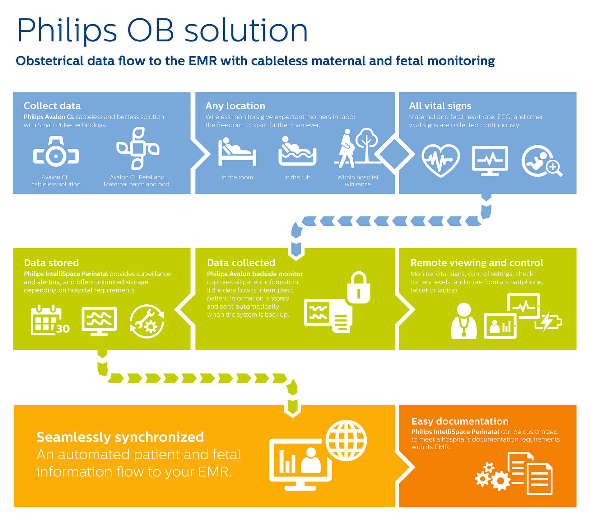 Go with the flow IntelliSpace Perinatal gathers data from Avalon fetal and maternal monitors with their connected cableless monitoring solutions and provides that data to your EMR. This single, centralized record can provide detailed data about each patient’s antenatal and labor and delivery experience, information for reimbursement, and data required by regulatory agents in certain markets.